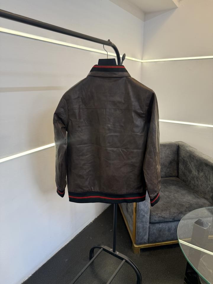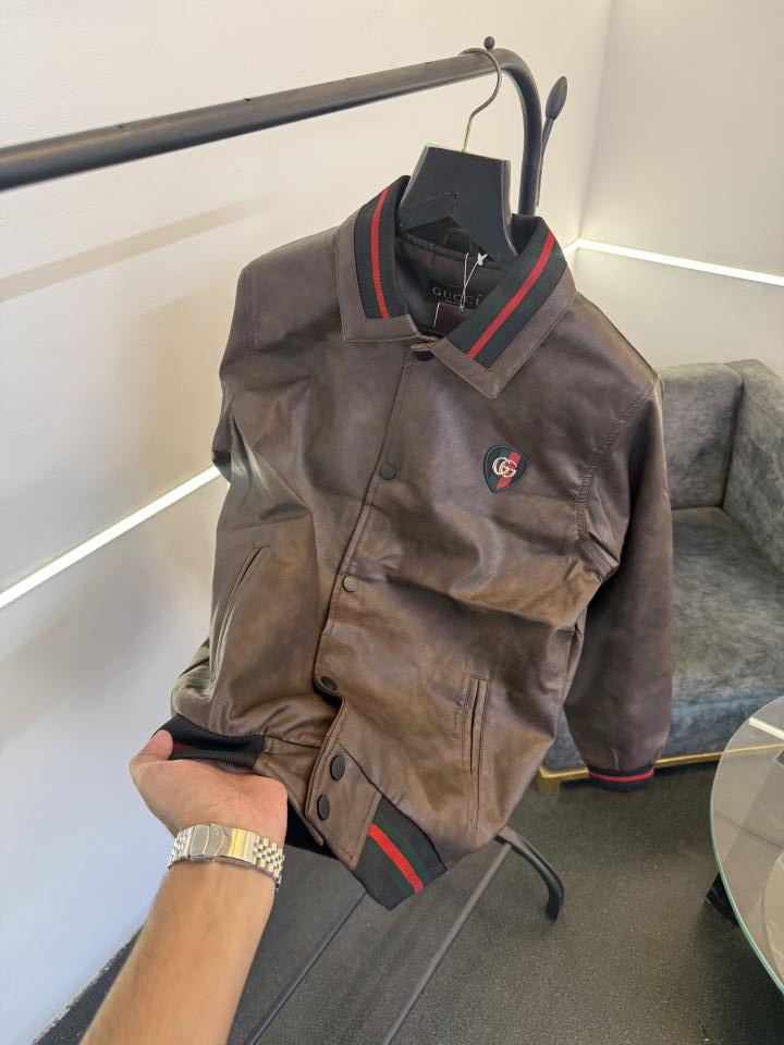 ? *Gucci imported front brand snap button imported varsity style leather jacket with brand zip and front pocket with inside pocket now in stock*?